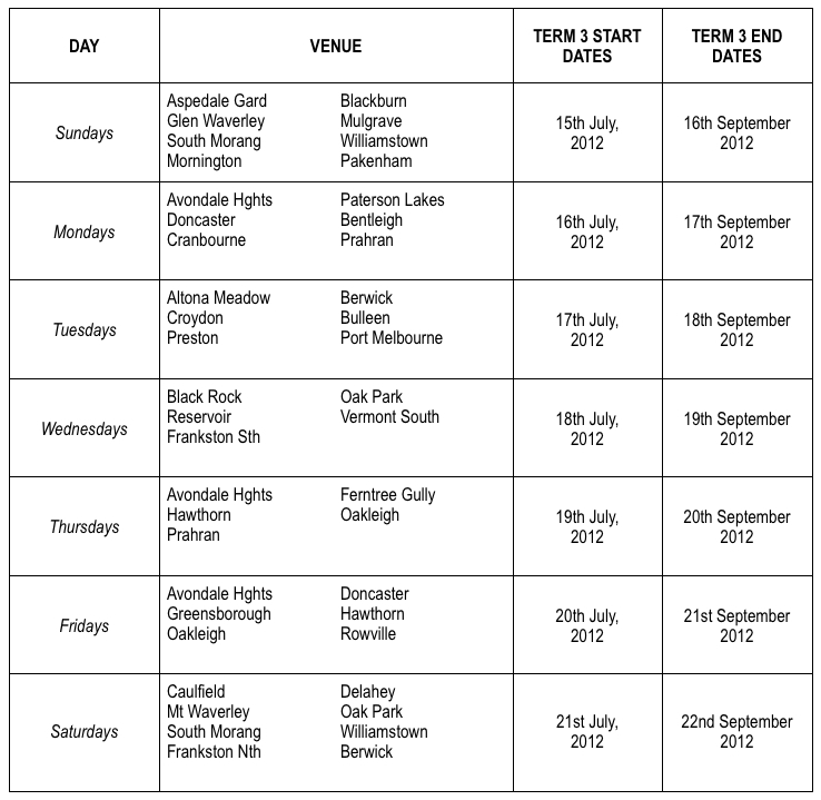 These are all the locations and start up dates for Term 1 2012